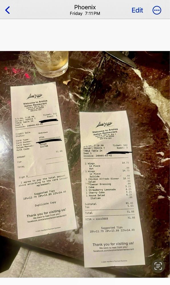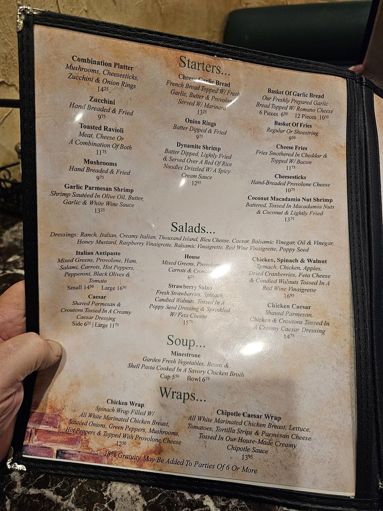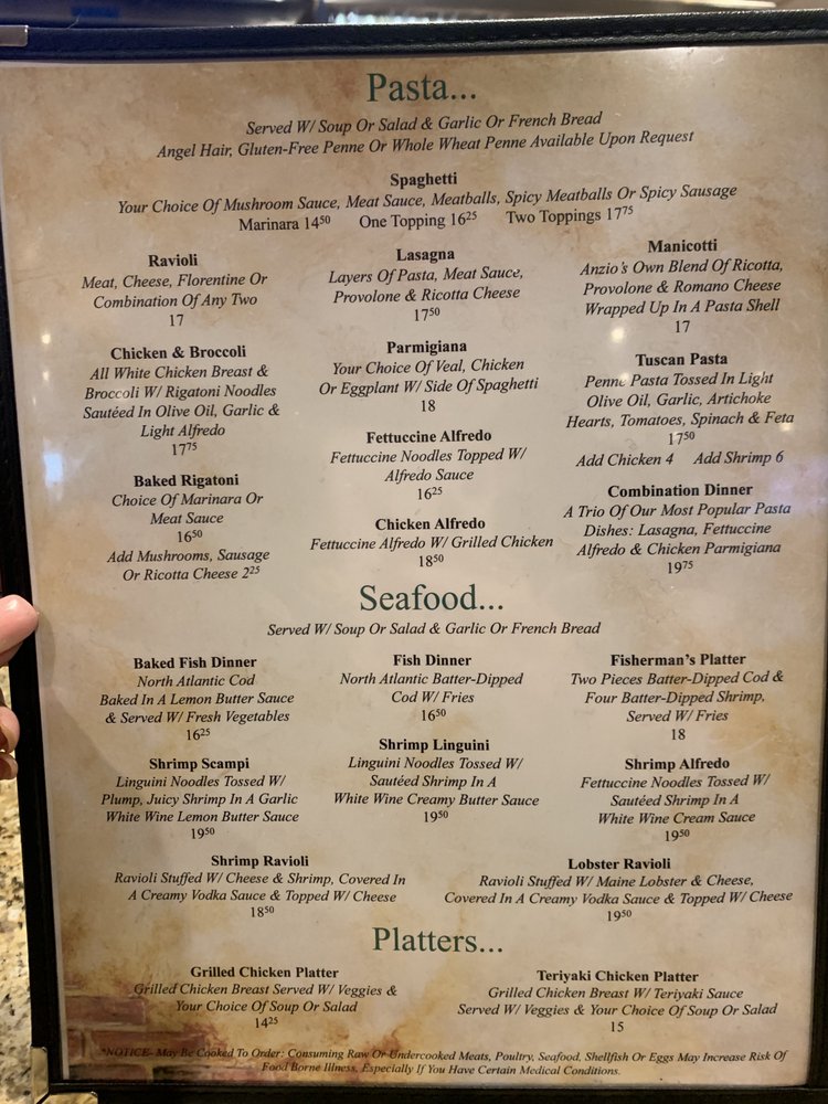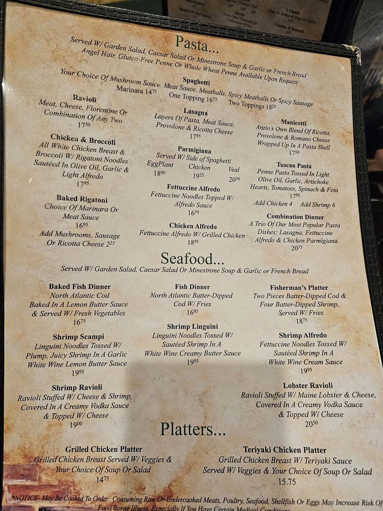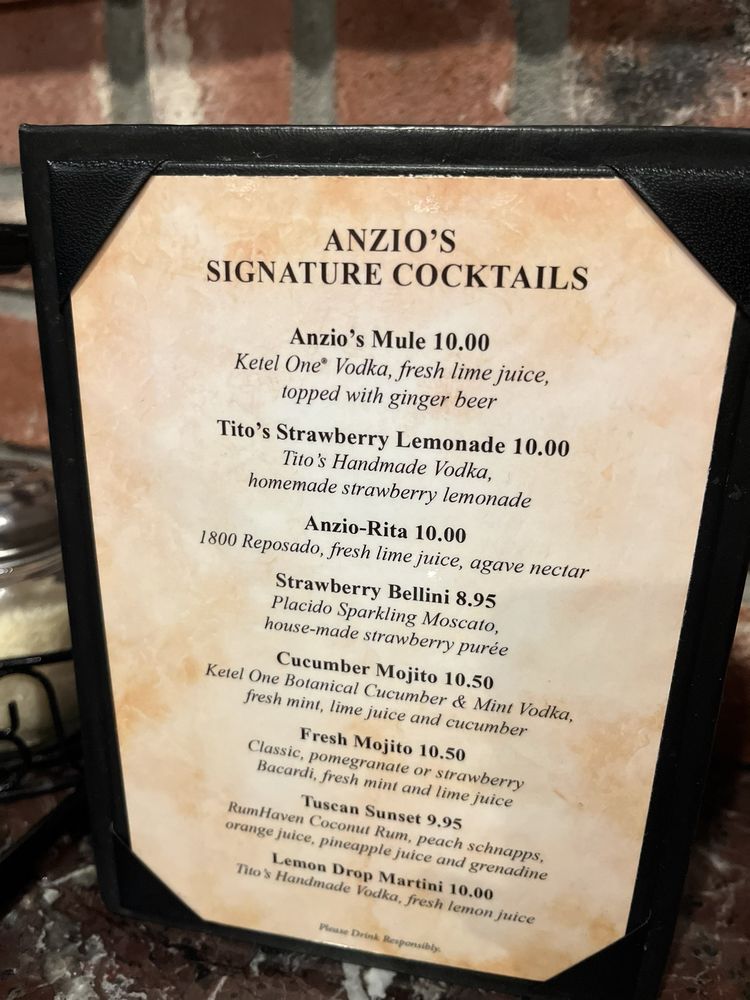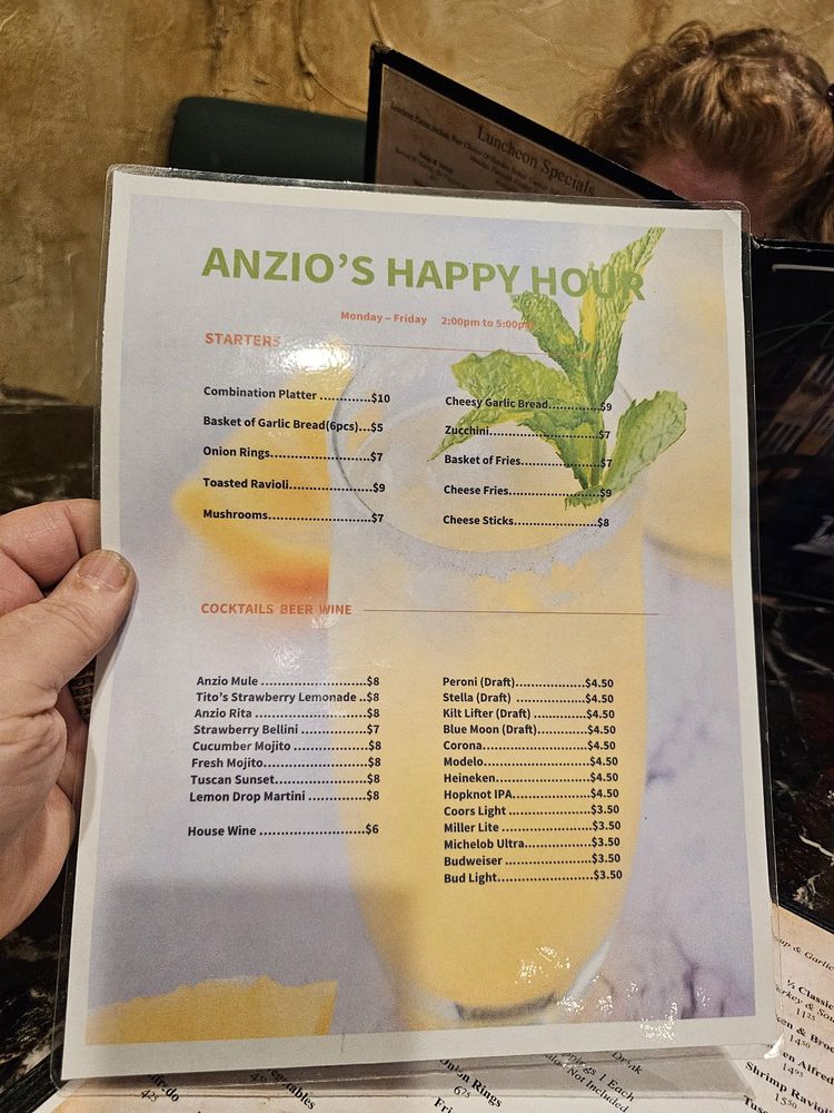 Anzios Italian Restaurant offers a wide range of Italian dishes in a casual setting with options for takeout, delivery, and reservations. The menu includes starters like Toasted Ravioli and Garlic Parmesan Shrimp, as well as soups like Minestrone and salads like the Italian Antipasto Salad. Customers rave about the delicious food, large portions, and friendly service, with standout dishes like the pizza and toasted ravioli receiving high praise. Despite its somewhat challenging location, Anzios is a favorite spot for those craving classic Italian cuisine in a welcoming atmosphere. The restaurant's traditional recipes and cozy ambiance make it a must-visit for lovers of Old School Italian food.